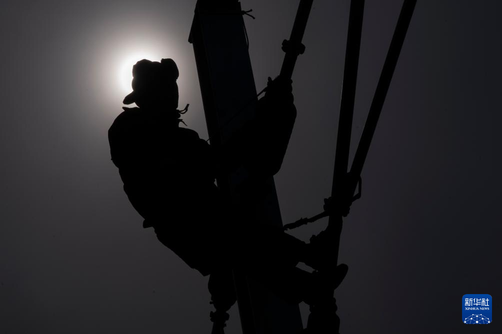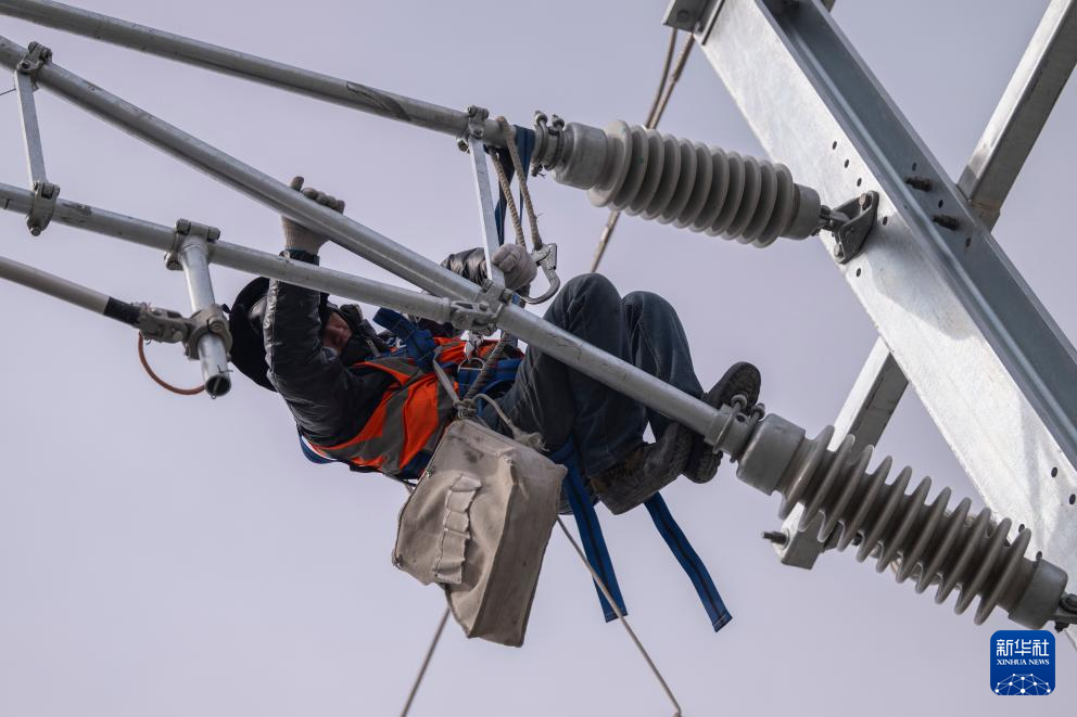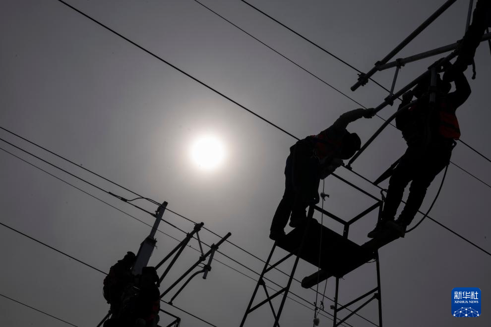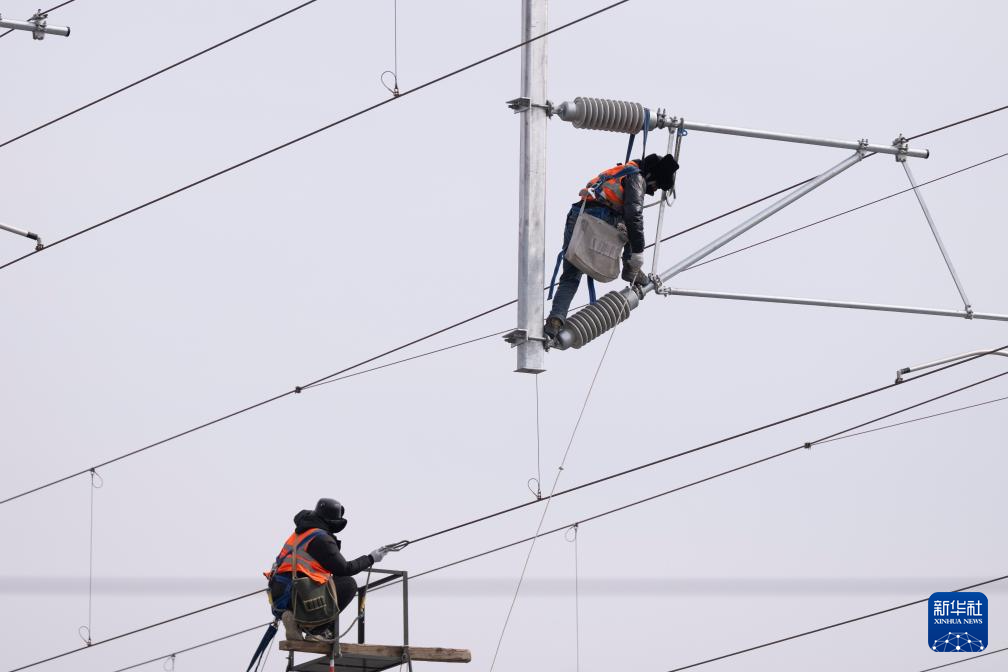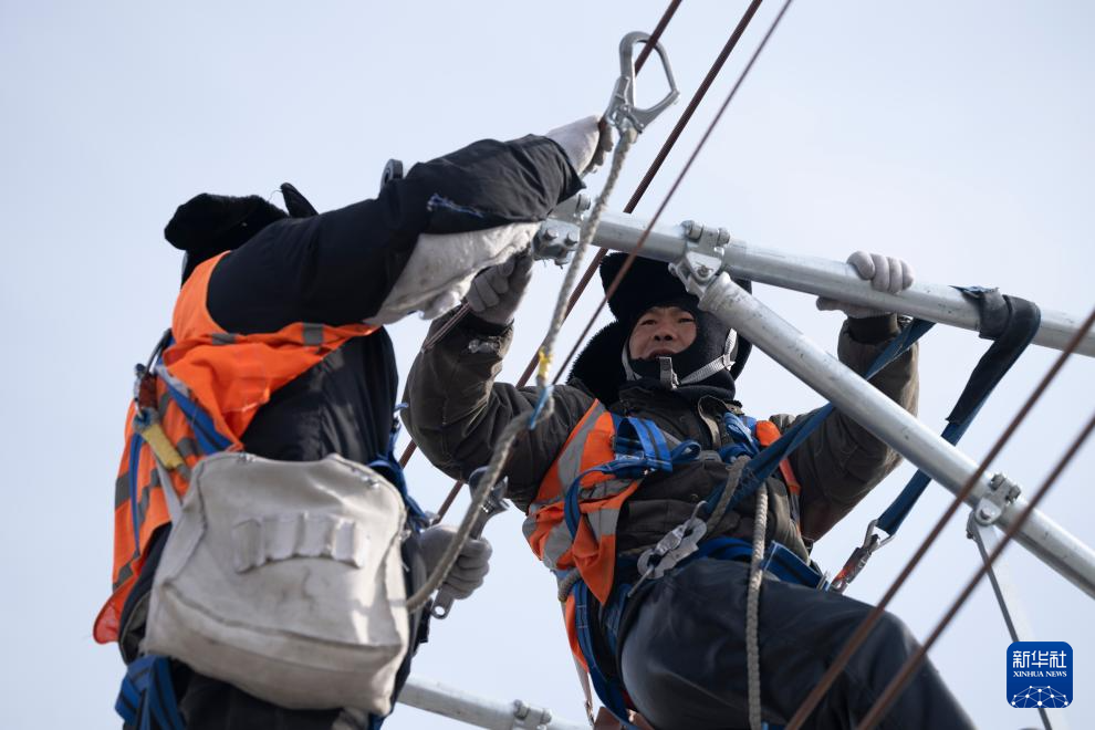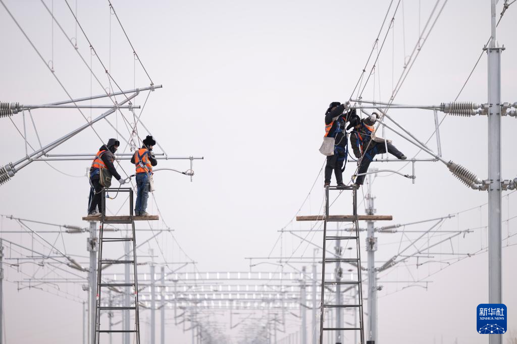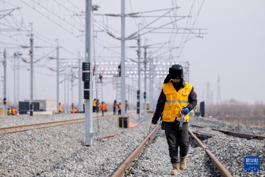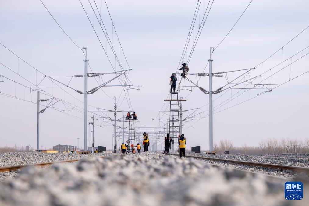 3月13日,在哈伊高铁绥化南站施工现场,来自中铁武汉电气化局的工人克服低温天气,全力推进哈伊高铁“四电”工程建设。据介绍,“四电”工程涵盖电力变电、接触网、通信信号、信息、灾害检测和相关配套房建等多个专业,目前工程建设已经完成90%。
