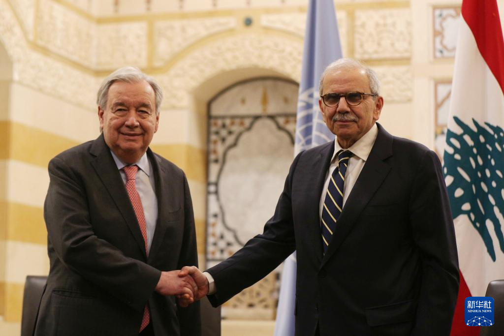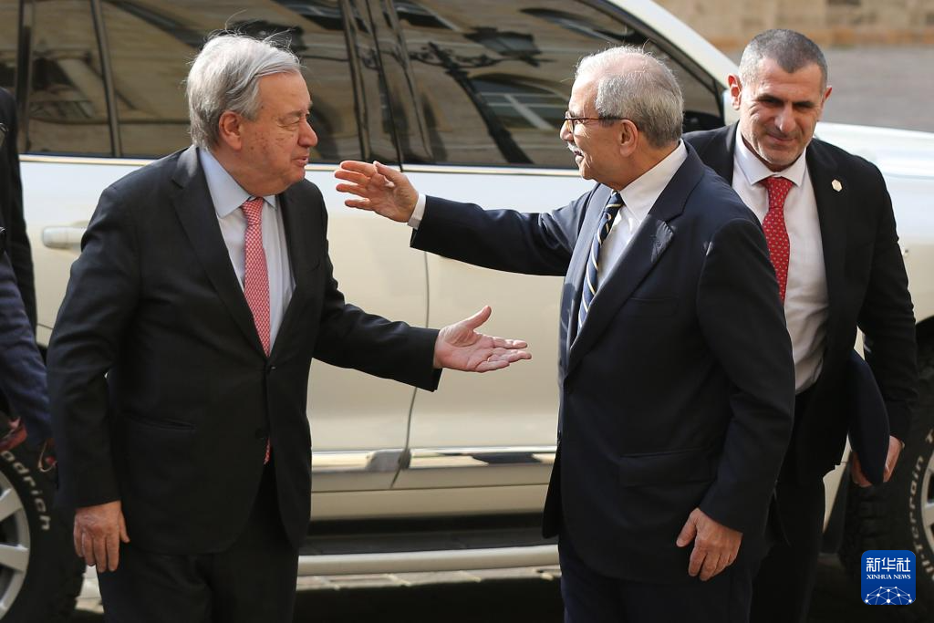 3月13日,在黎巴嫩首都贝鲁特,黎巴嫩总理萨拉姆(右)欢迎联合国秘书长古特雷斯访问黎巴嫩。