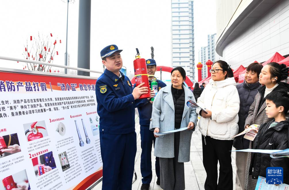 3月15日,工作人员在河南省济源市消费者权益日主题活动现场为消费者介绍如何鉴别假冒伪劣消防产品。