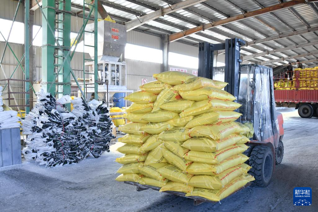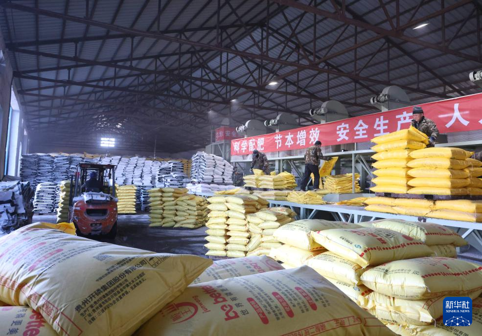 3月16日,在北大荒集团黑龙江建设农场有限公司拌肥中心车间内,工人将化肥原料转运至智能拌肥生产线。