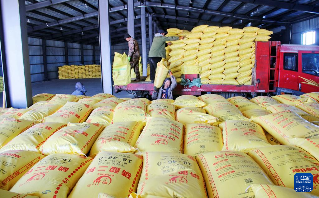 3月16日,在北大荒集团黑龙江格球山农场有限公司农业科技服务中心,工作人员在搬运配方肥料。