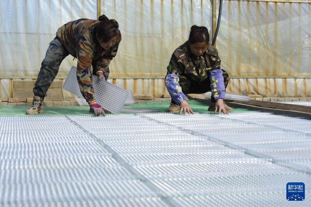3月17日,在北大荒集团黑龙江绥滨农场有限公司东井管理区育秧大棚基地,种植户在进行摆盘作业。