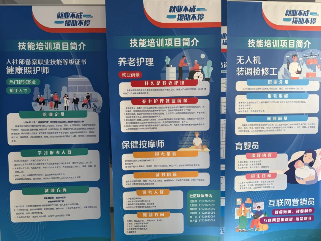 为促进有效就业,使有意愿、有能力就业的居民群众多掌握一项就业技能,现场特设技能培训服务专区,展示技能项目及相关政策包括养老护理、保健按摩师、无人机装调检修工、健康照护师、育婴员等实用性强、上岗快的培训项目,详细讲解培训对象、报名条件、免费政策、考核取证等全流程信息,助力群众以技就业、稳定增收,为居民提供优质、贴心的服务。