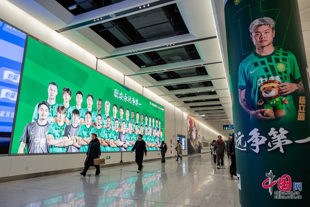 此次主题车站打造,以“固定站点+流动车厢”双场景联动,打造全景式沉浸氛围,不仅刷新了市民的日常出行体验,更让往返球场的球迷提前进入“观赛状态”,实现“未进球场,先入主场”。站内十余项优质媒体资源齐上阵——站厅LED电子屏、灯箱、梯顶LED、吊挂式LED、站台立式大屏等循环播放国安新赛季赛事集锦与高光瞬间;11根站厅包柱量身定制国安球员海报,整个车站空间被足球主题元素全面覆盖,沉浸感无处不在,让每位乘客都能感受到绿茵激情。通过将足球热情融入轨道交通,引导更多球迷和市民选择地铁前往赛场,有效缓解周边交通压力,助力城市低碳环保。