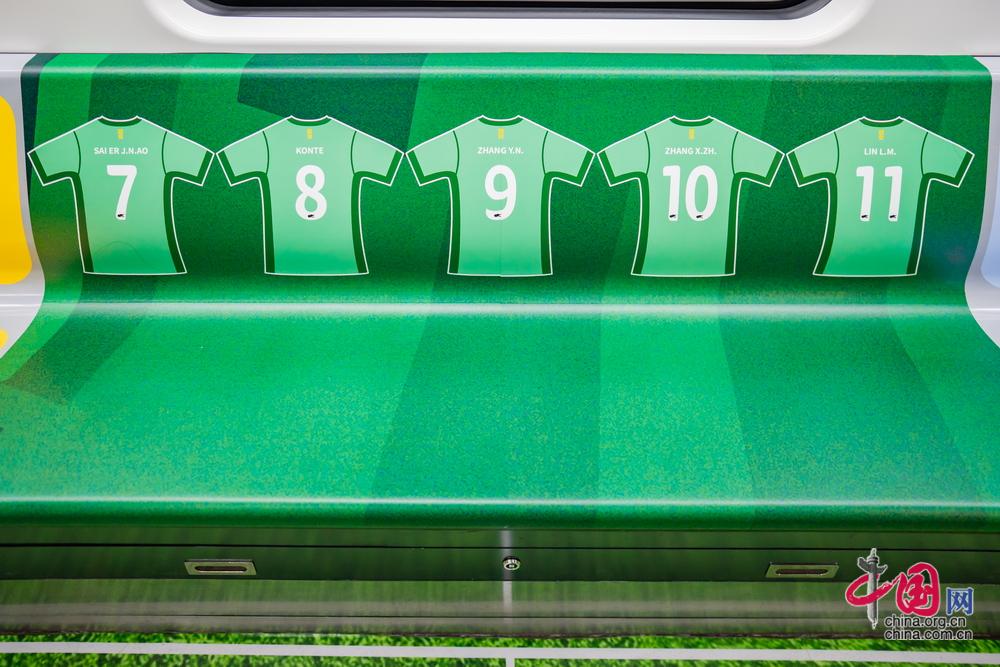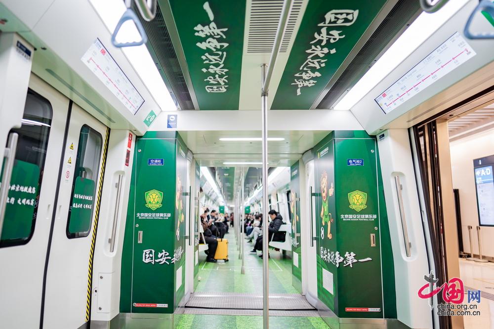 北京地铁3号线主题列车与主题车站同步推出,车厢内从ABC位、地贴、顶贴到座椅贴全面焕新,座椅区域特别印制国安球员的球衣号码与专属图案。中国网记者 郑亮摄