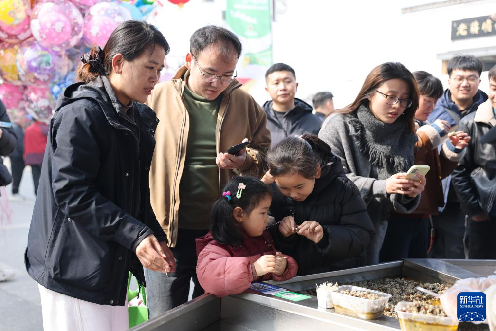 3月21日,在淮安市洪泽区蒋坝镇螺蛳美食旅游季市集上,游客在购买、品尝螺蛳。