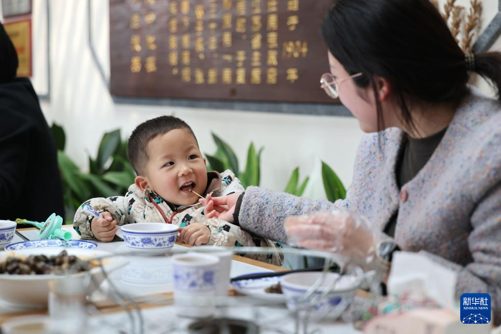 3月21日,在淮安市洪泽区蒋坝镇一家饭店,家长给小朋友品尝螺蛳。