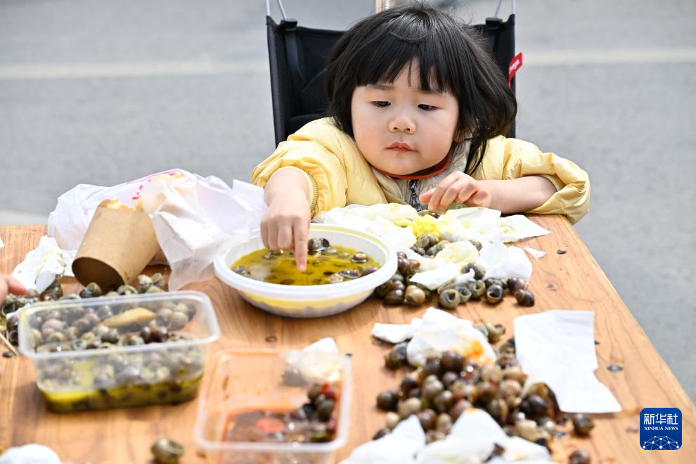 3月21日,小朋友在淮安市洪泽区蒋坝镇螺蛳美食旅游季市集上品尝螺蛳。