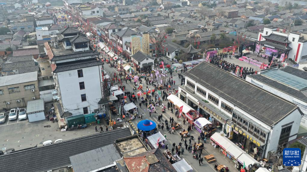 3月21日,游客在淮安市洪泽区蒋坝镇螺蛳美食旅游季市集上游玩(无人机照片)。