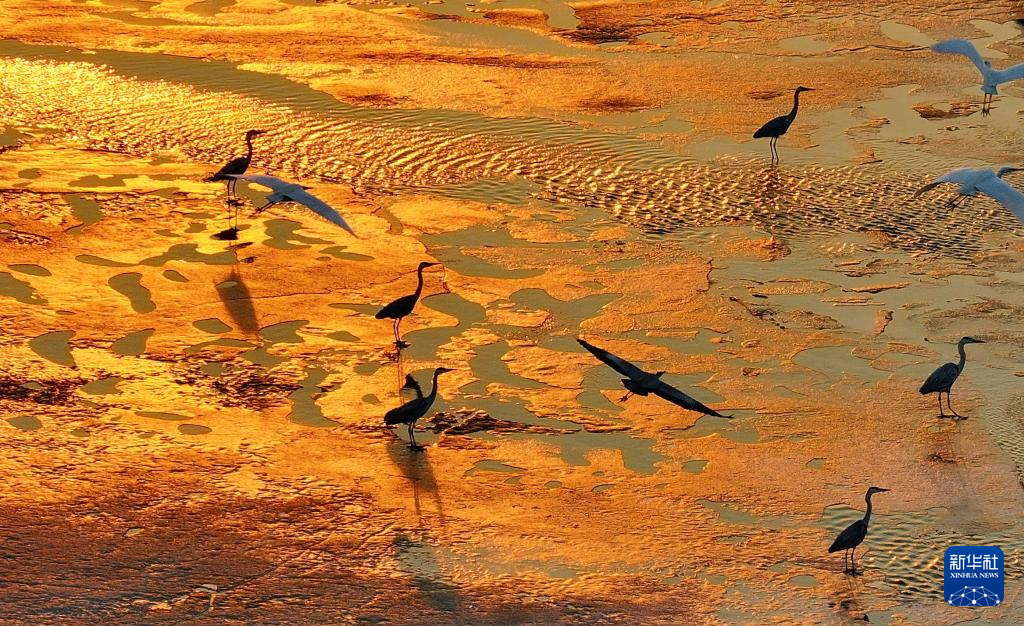 3月21日,候鸟在黑龙江省牡丹江市宁安市一处水域休憩(无人机照片)。