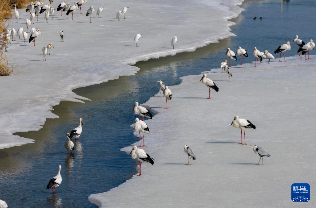 3月23日,在黑龙江省双鸭山市宝清县境内的黑龙江东升省级自然保护区内,一群候鸟在冰面上休息(无人机照片)。