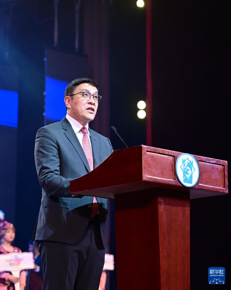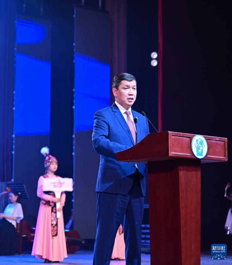 3月24日,在吉尔吉斯斯坦首都比什凯克,比什凯克市市长朱努沙利耶夫在开幕式上致辞。