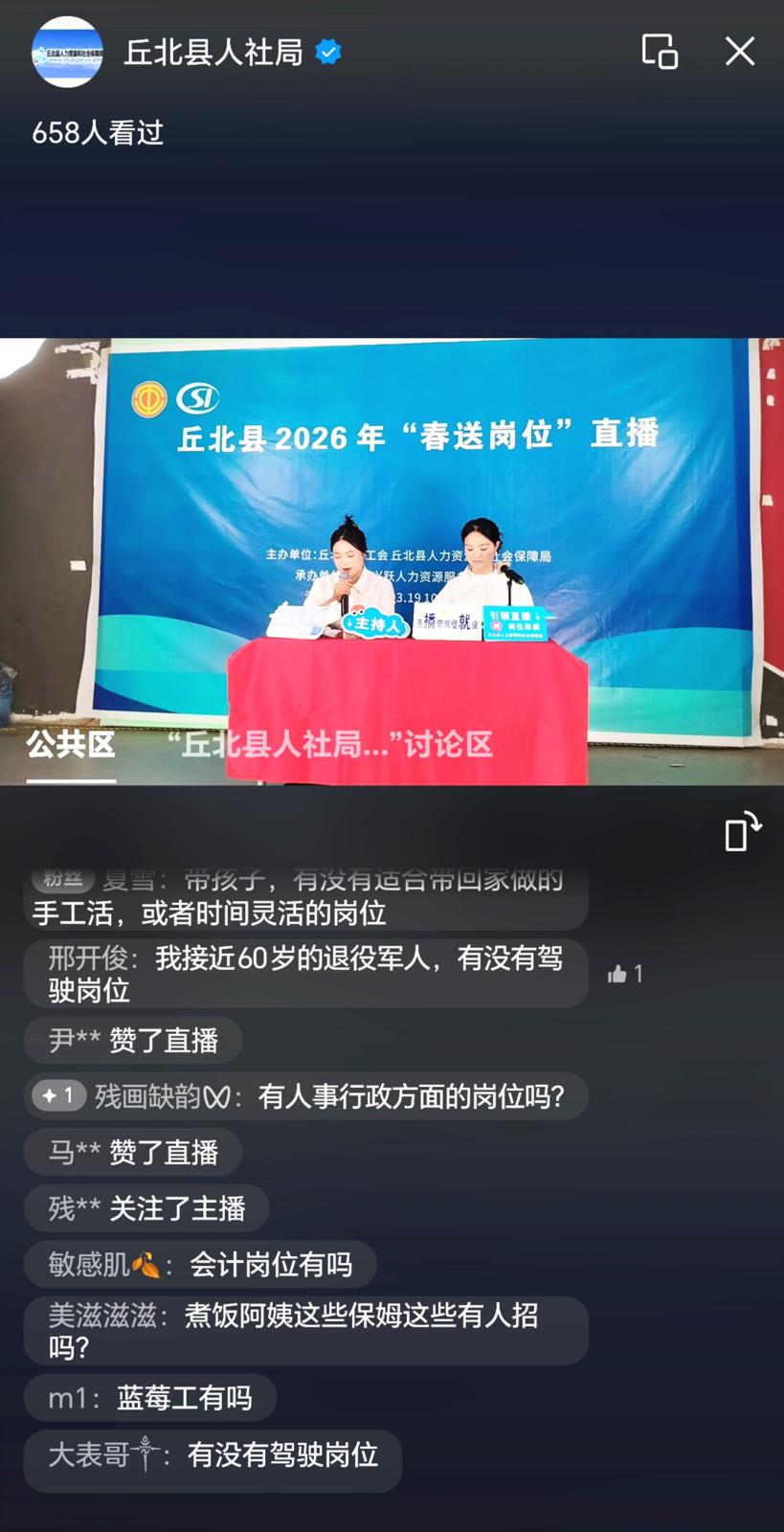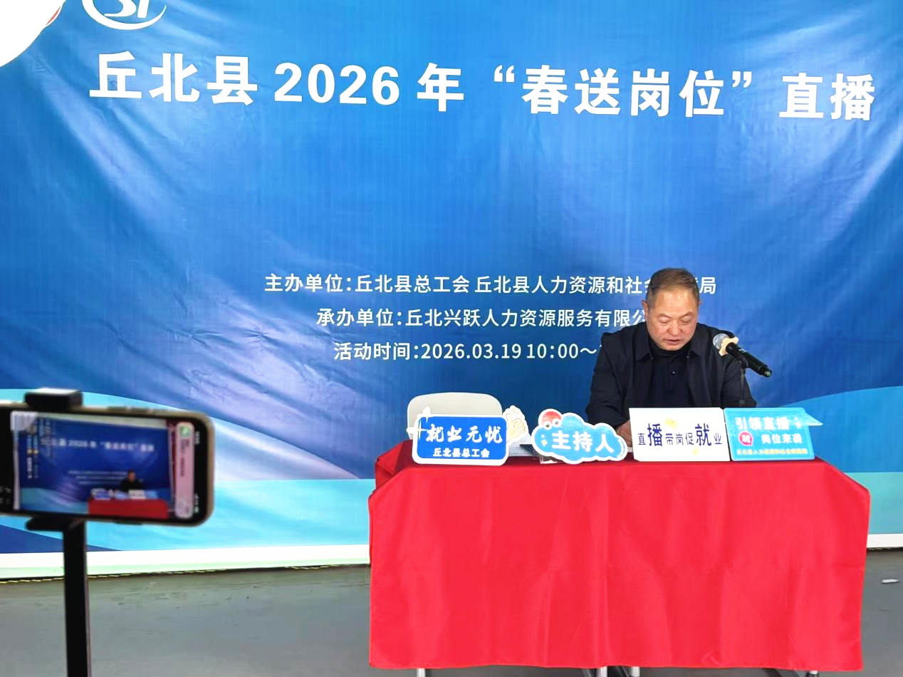 近日,由丘北县人力资源和社会保障局主办,县总工会、丘北兴跃人力资源服务有限公司承办的2026年“春送岗位”就业服务专场直播带岗活动如期举行。活动将招聘会搬进直播间,把岗位送到“指尖”,让求职者足不出户即可实现“云”选岗、“云”面试。