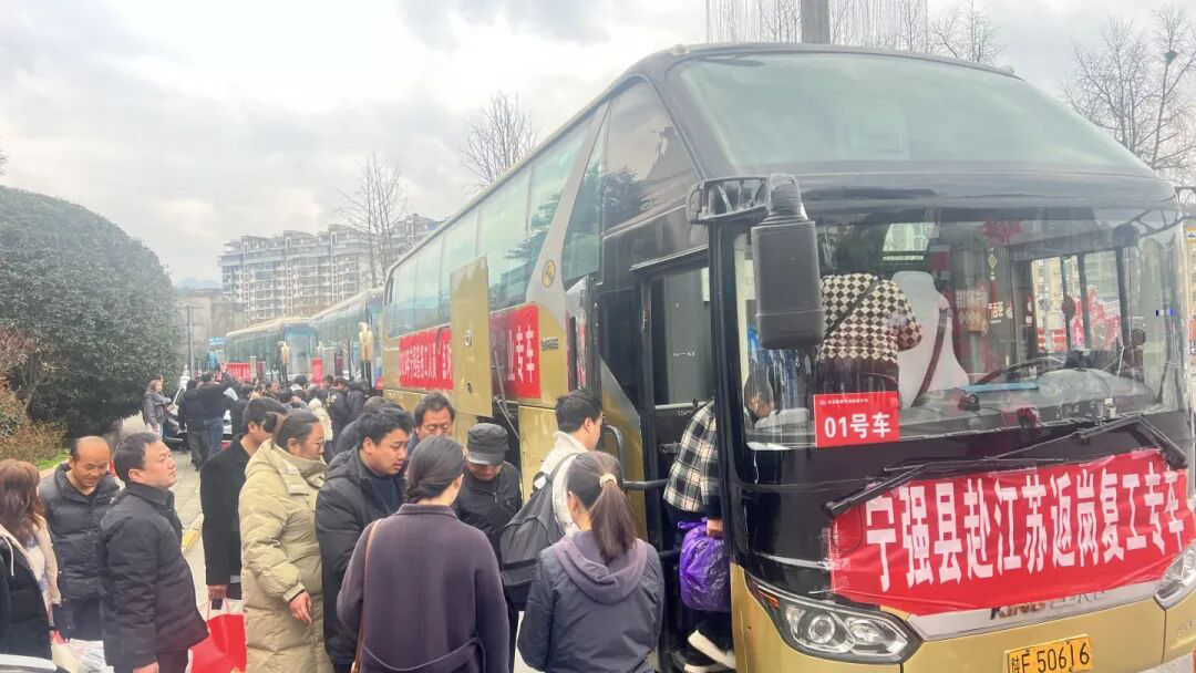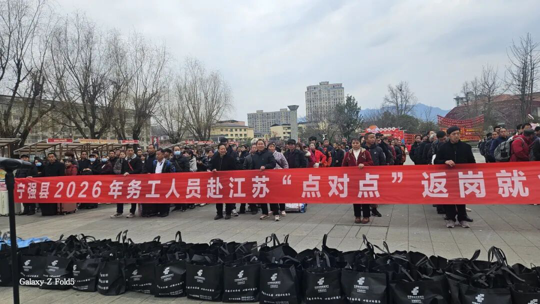 3月4日清晨的宁强县人民广场,5辆悬挂着“宁强县赴江苏返岗复工专车”横幅的大巴车整装待发。这是宁强县为2026年首批赴江苏务工的195名乡亲们举行的欢送仪式。