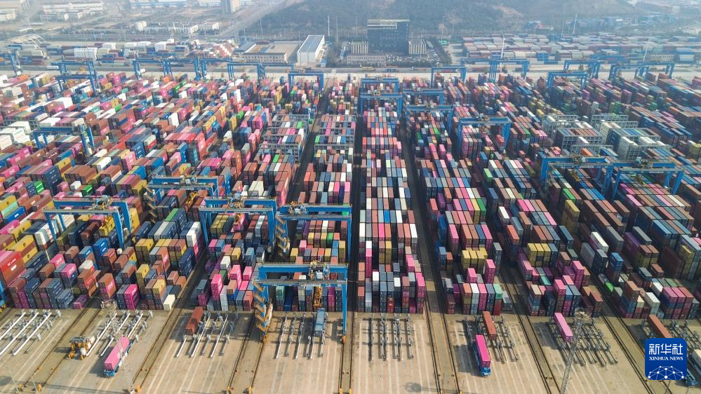 正在进行集装箱装卸作业的青岛港全自动化集装箱码头(3月25日摄,无人机照片)。