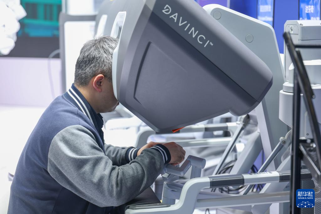 3月29日,观众在2026中国医学装备展览会现场体验达芬奇手术机器人模拟器。