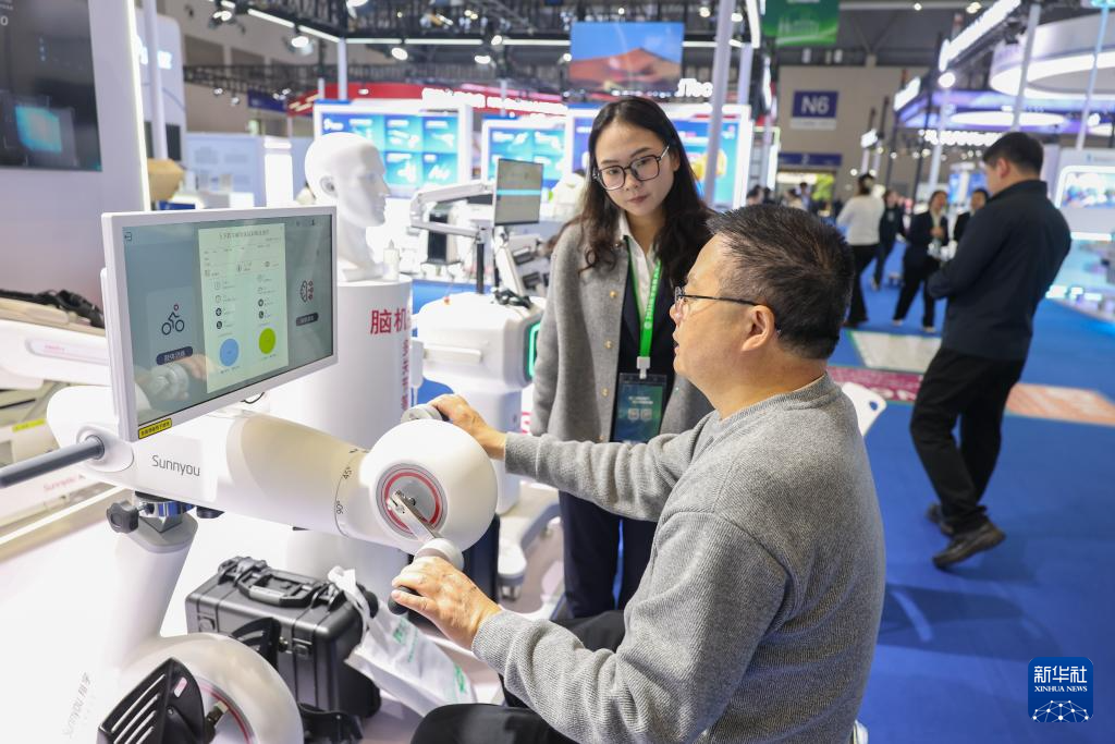 3月29日,观众在2026中国医学装备展览会上体验脑机接口上下肢主被动康复训练仪。