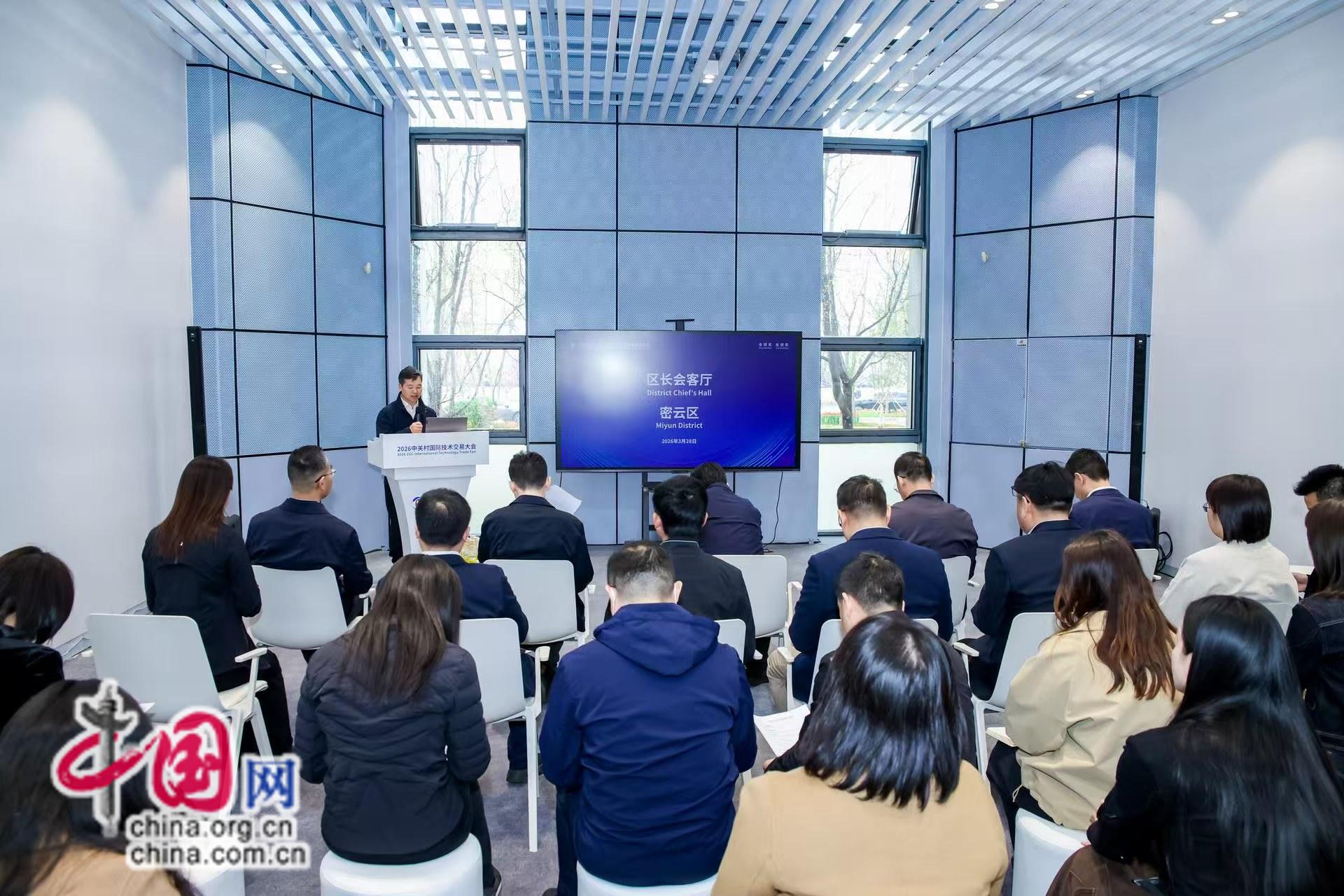 中国网讯(记者 王瑞芳)3月28日下午,2026中关村论坛年会中关村国际技术交易大会“区长会客厅”密云区专场在中关村国际技术交易中心成功举办。密云区政府副区长施辉阳,区投资促进服务中心党组书记、主任金海江,中关村密云园工委书记、管委会主任张治,区经济和信息化局副局长王效辉出席活动,与创新项目代表深入交流。区科委党组书记、主任彭根明主持活动。