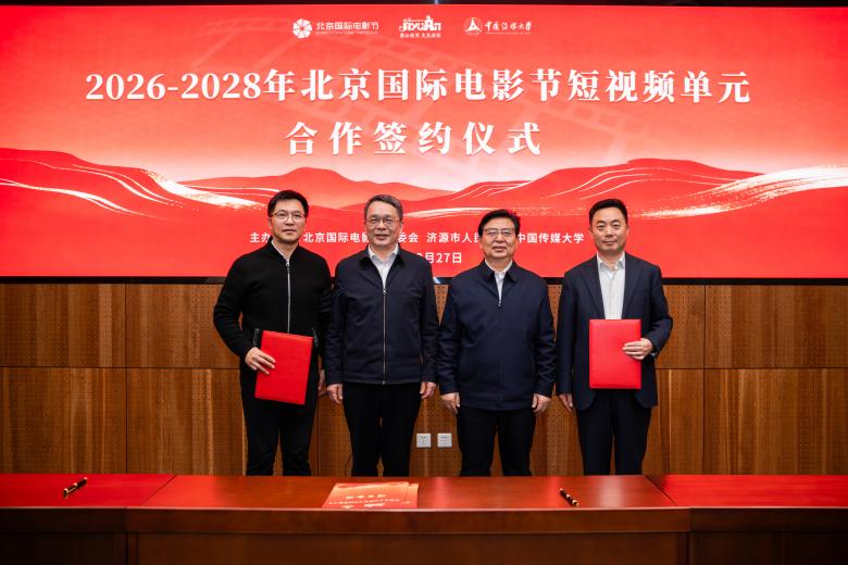2026年3月27日,中国传媒大学与济源市人民政府在中传学术中心举行了北京国际电影节短视频单元合作签约仪式。济源示范区党工委书记、济源市委书记徐衣显,济源示范区管委会党组成员、济源市政府副市长赵会生,中国传媒大学校长张树庭,中国传媒大学电视学院党委书记曾祥敏出席签约仪式并致辞。中国传媒大学电视学院副教授、中国网络视频研究中心副主任、北京国际电影节短视频单元荣誉盛典总导演马铨主持签约仪式。