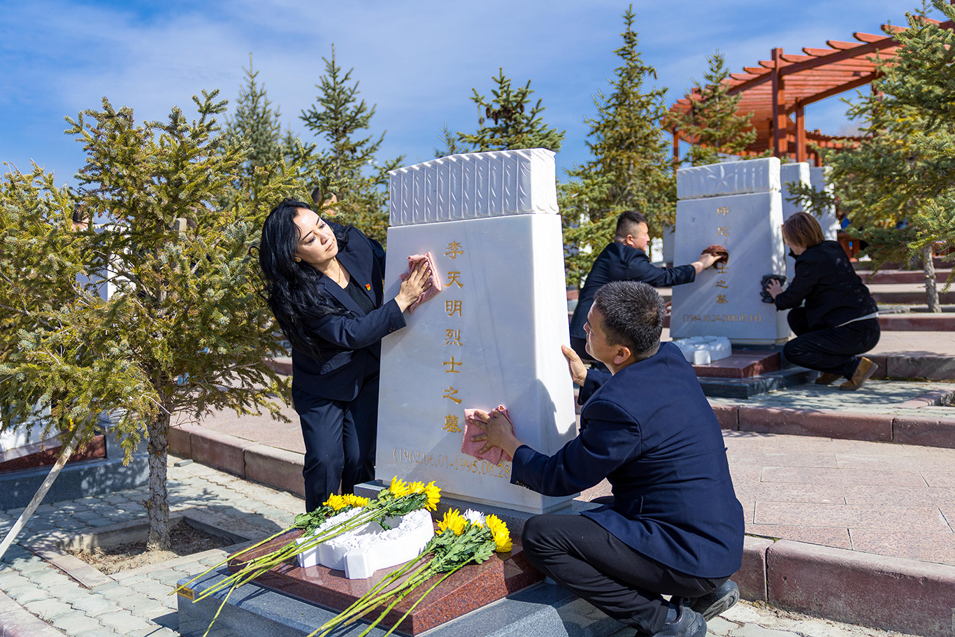 2026年4月1日,党员正在擦洗烈士墓碑。