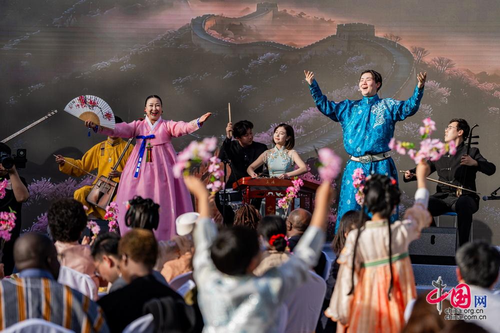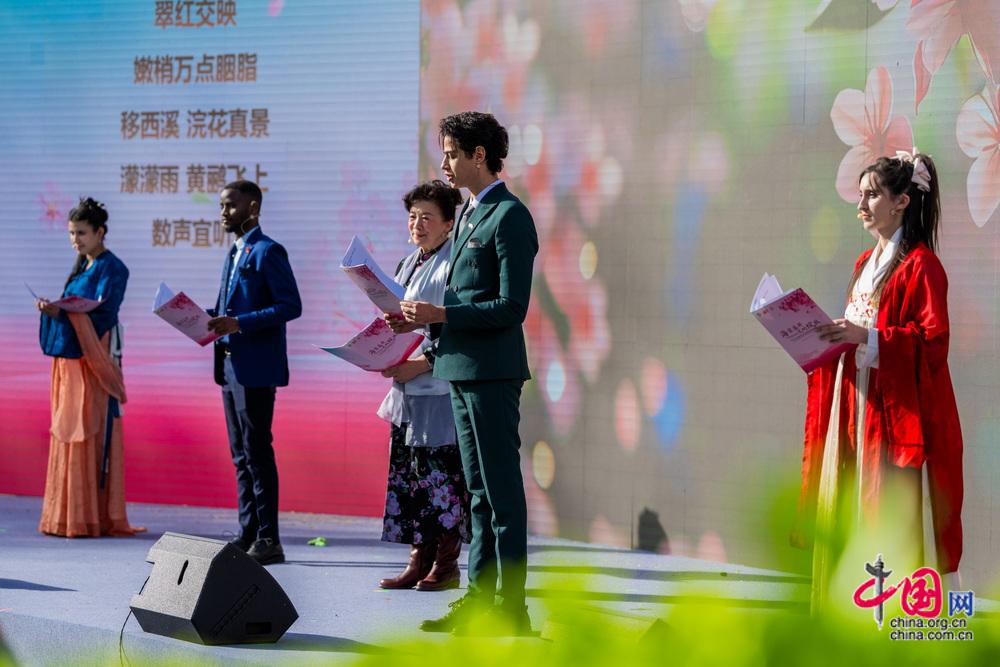 诗会在鼓乐表演《鼓韵和鸣》中启幕,雄浑磅礴的中国鼓与神秘灵动的非洲鼓交相呼应,奏响中非文化交融的蓬勃生机,也为全民阅读注入多元文化气息。北京市正泽学校的学生以稚嫩童声唱响梨园新韵,一招一式诠释国粹魅力;梅派艺术第三代传承人、国家一级演员胡文阁,以梅派青衣独有的雍容气度演绎《洛神》,水袖起落间尽显“翩若惊鸿 婉若游龙”的仙姿神韵。诗歌朗诵《诗无界·声织春》中,国家一级演员杜宁林与四位国际友人联袂登台,以中、法、葡、阿、英五种语言将中外经典诗文交织共鸣。展开一场跨越山海的诗意对话,让文明互鉴的文化内涵在舞台上熠熠生辉。互动环节,朗诵艺术家陈铎与国际友人柯马凯以饱含深情的朗诵,在书香诗韵中追忆先贤、寄情海棠。中央民族大学音乐学院的师生们带来器乐演奏《合和之美》,以悠扬和鸣架起艺术交流的桥梁。北京舞蹈学院的学子们演绎舞蹈《唐印》,尽显东方美学底蕴。北京音协童声合唱团以“海棠合欢”为主题,用清澈的歌声唱响《一路欢笑一路歌》,将整场活动推向高潮。