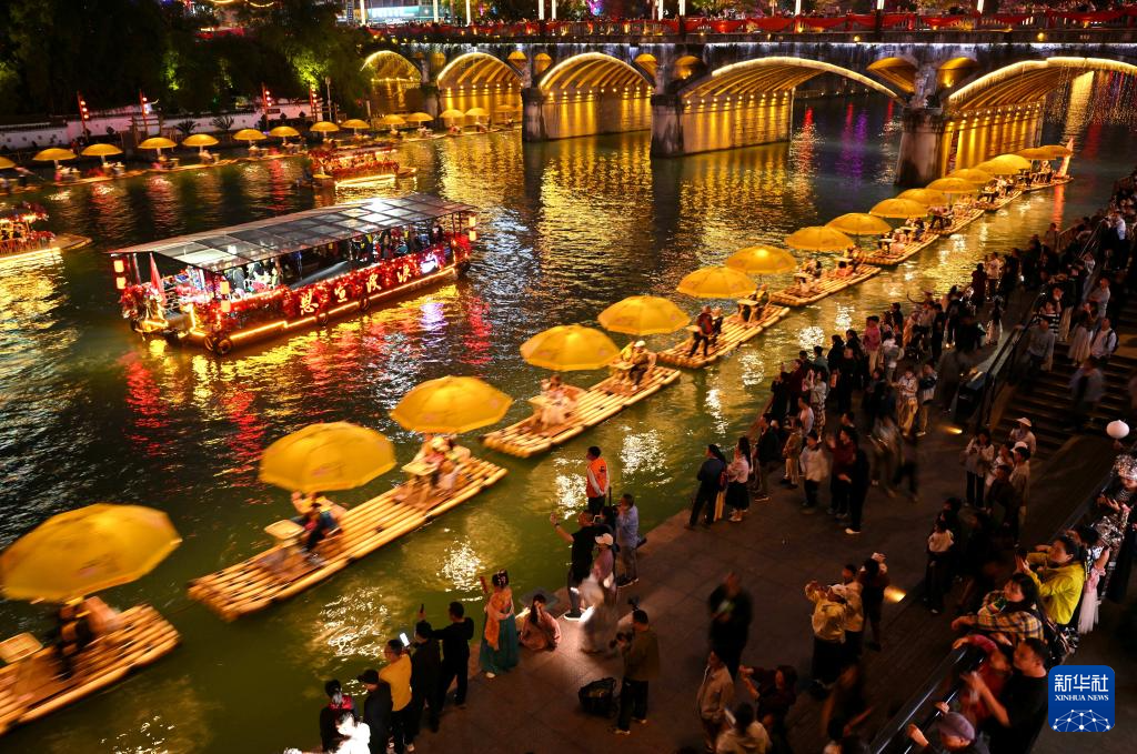 4月4日,游客在湖北省宣恩县城贡水河畔乘坐“龙游贡水”竹筏赏景游玩。