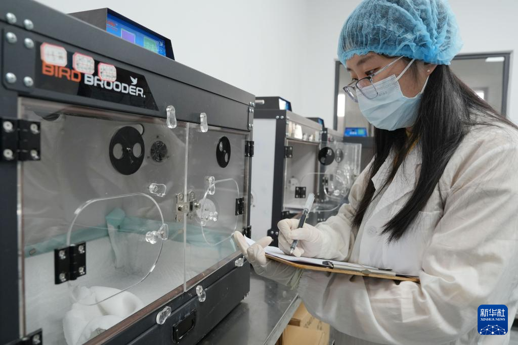 4月8日,在浙江省湖州市德清县下渚湖朱鹮繁育研究基地,工作人员检查刚出壳的朱鹮幼鸟。
