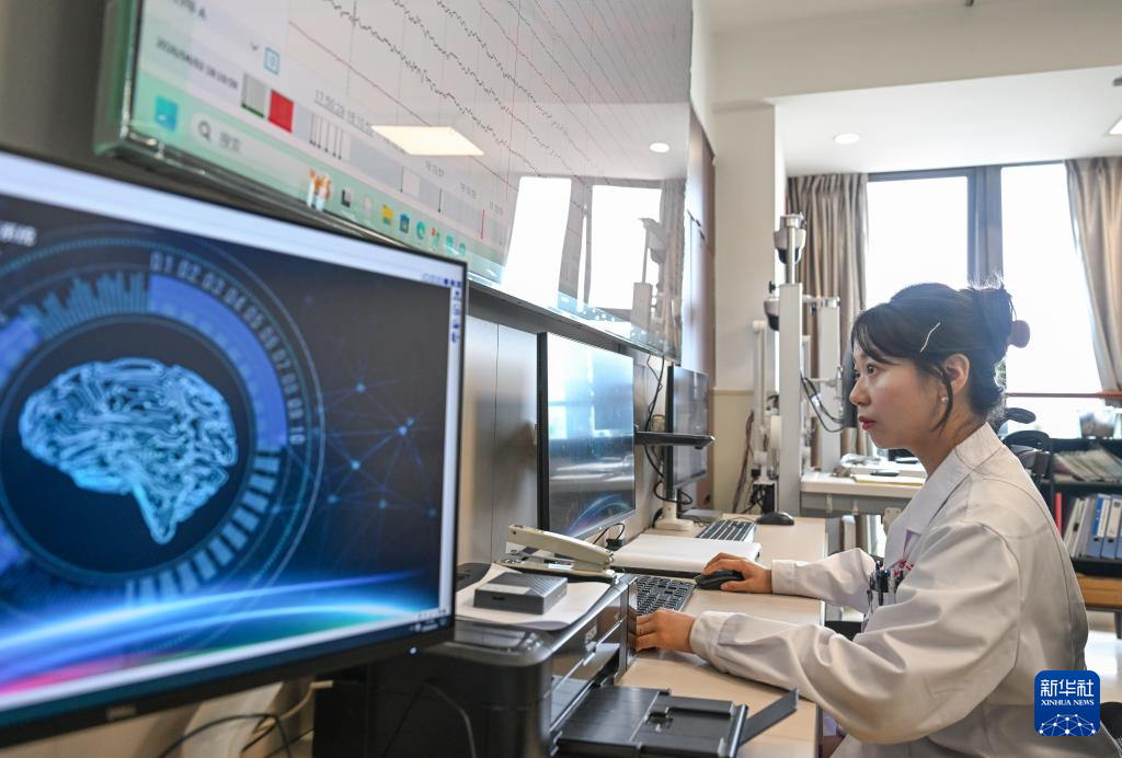4月10日,逯菀婷医生在电脑前查看患者的脑电图数据。
