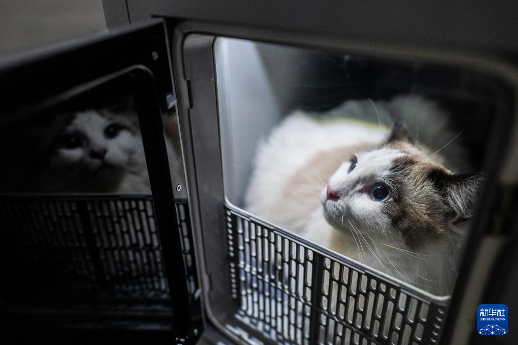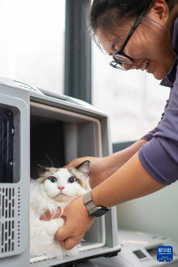 4月11日,在湖北省武汉市汉口站,旅客把一只宠物猫放进专用宠物运输箱内。