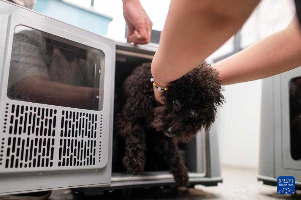 4月11日,在湖北省武汉市汉口站,旅客把宠物狗放进专用宠物运输箱内。