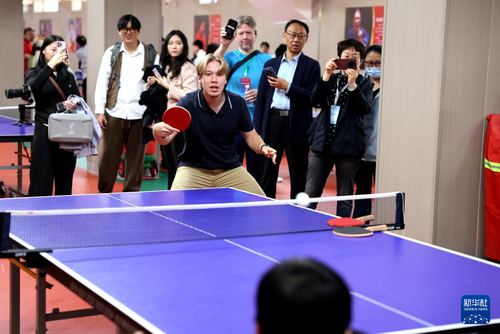 4月11日,参加活动的运动员、体育界人士在河北正定国家乒乓球训练基地进行乒乓球友谊赛。
