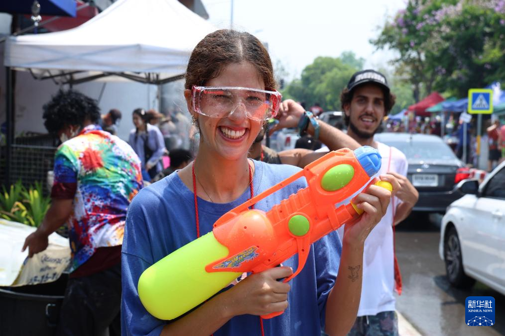 4月13日,人们在泰国清迈街头参加泼水节庆祝活动。
