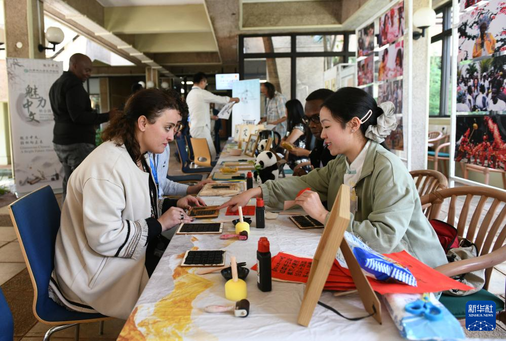 4月13日,在肯尼亚内罗毕,人们在联合国中文日文化体验活动现场体验书法拓印。