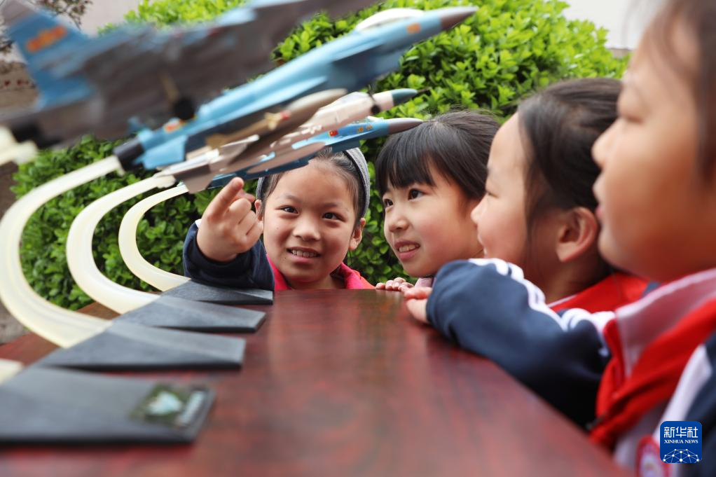 4月13日,在河北省唐山市丰润区火石营镇黄昏峪小学,学生通过模型了解国防武器知识。