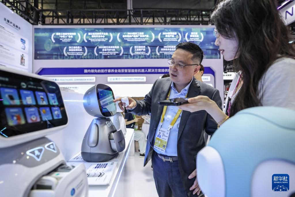 4月13日,参观者在第六届消博会现场了解一款康养陪伴机器人。