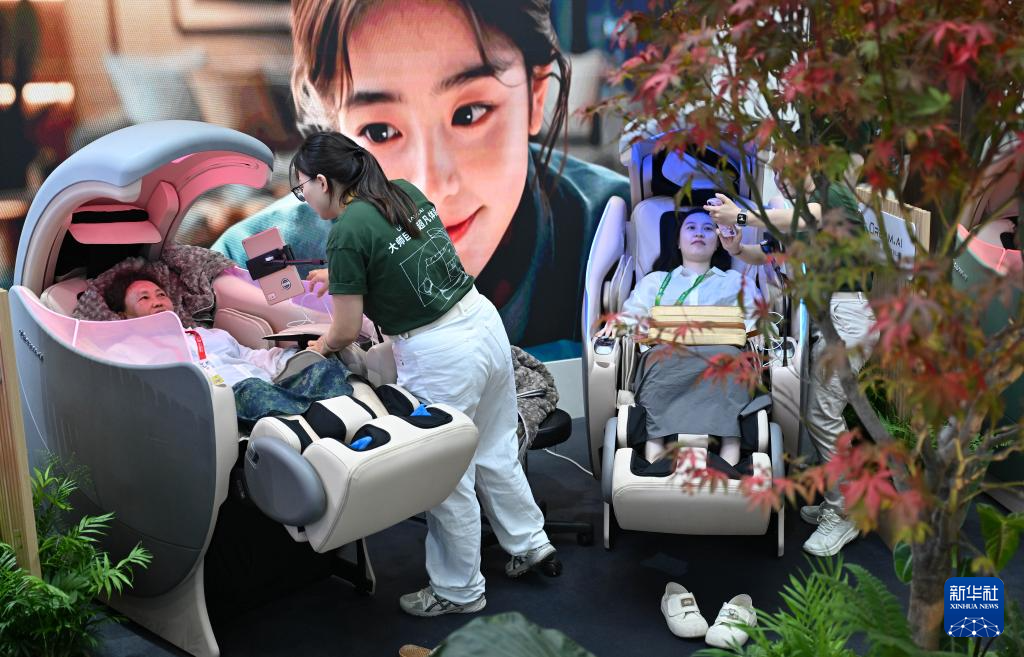 4月13日,参观者在第六届消博会现场体验按摩椅。