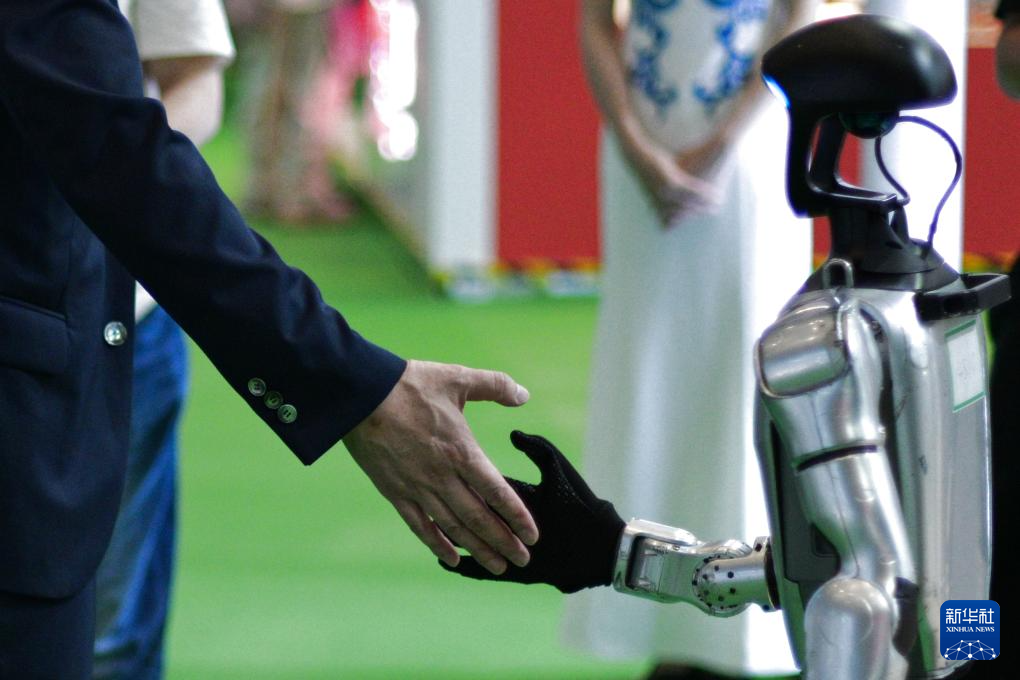 4月13日,一名男子在第六届消博会上与一款人形机器人握手。
