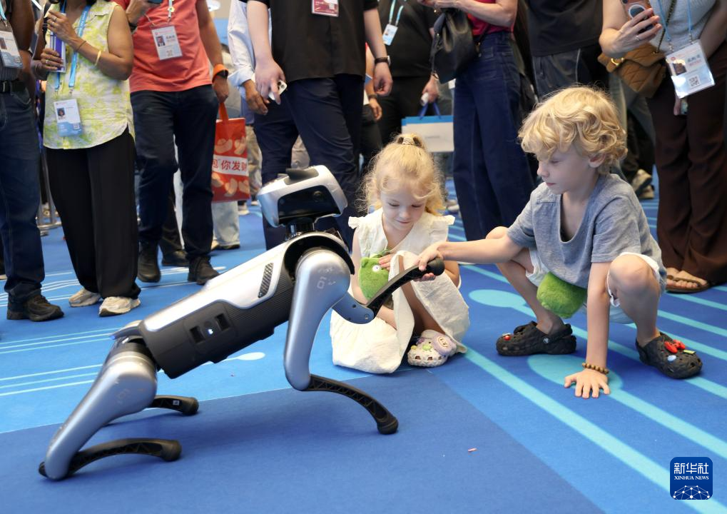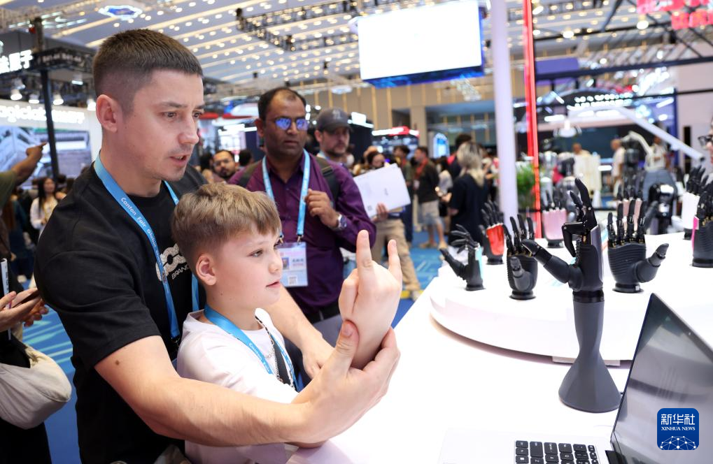 4月15日,境外采购商带着孩子在广交会上和灵巧手互动。