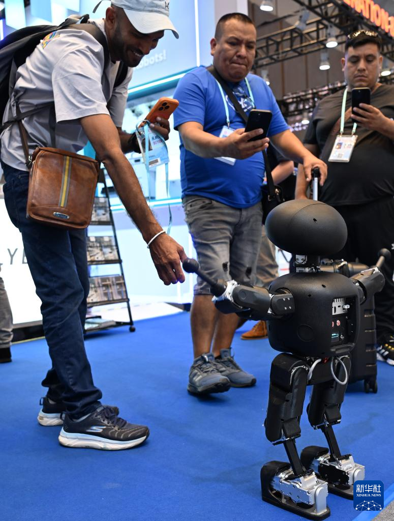 4月15日,境外采购商在广交会上和一款桌面级人形机器人互动。