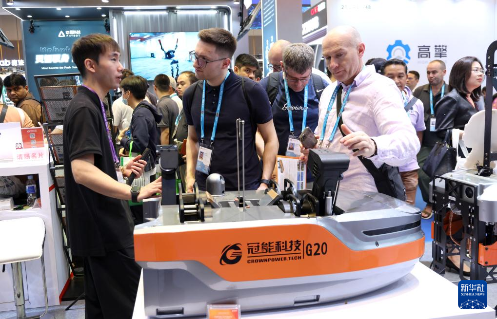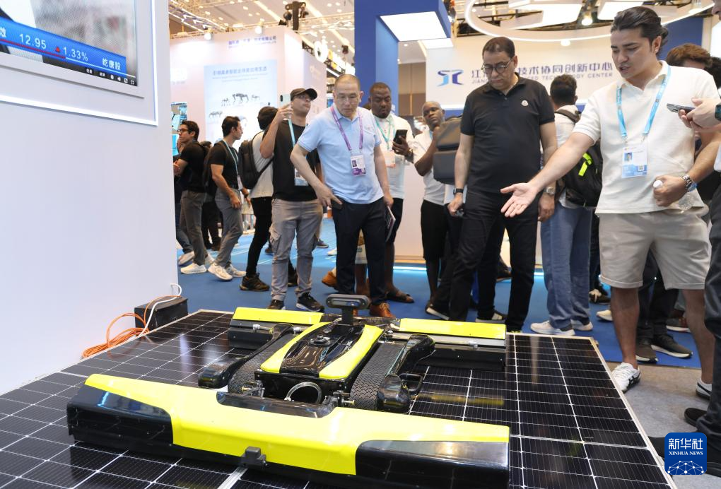 4月15日,境外采购商在广交会上参观了解一款光伏板清洁机器人。