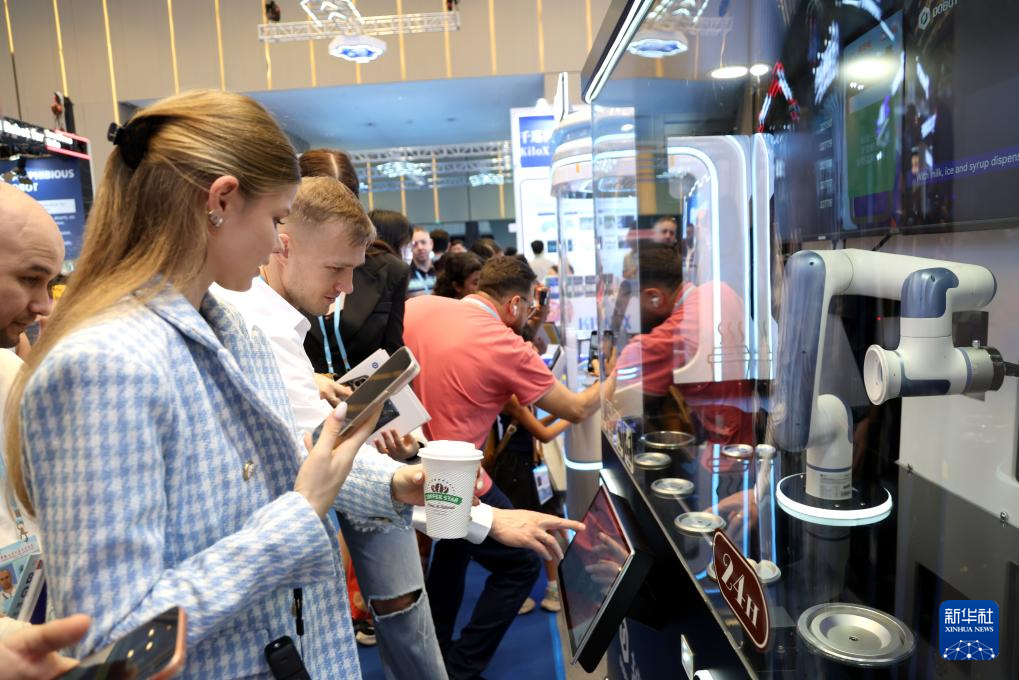 4月15日,境外采购商在广交会上观看自动冰激凌机器人。