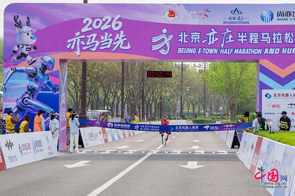 中国网讯(记者 董宁 郑亮)4月19日,在全球首个人形机器人马拉松品牌赛事——2026北京亦庄人形机器人半程马拉松赛场上,齐天大圣队的“闪电”机器人凭借50分26秒(净用时)的成绩(人类半程马拉松世界纪录为56分42秒)获得冠军。