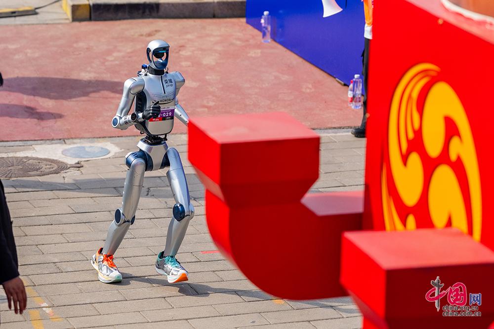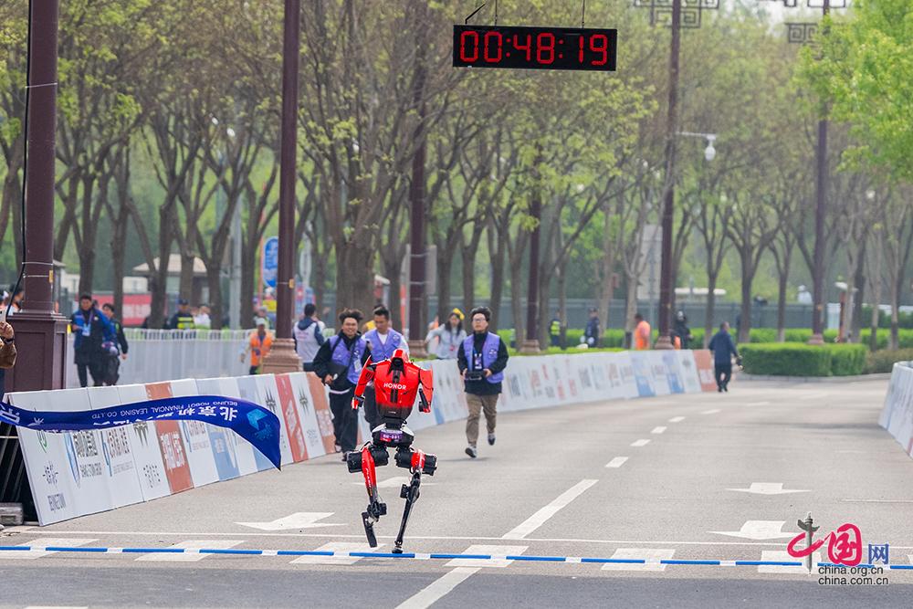 4月19日,2026北京亦庄人形机器人半程马拉松赛开跑,图为第一个冲过终点的遥控操作组人形机器人。中国网记者/郑亮 摄影
