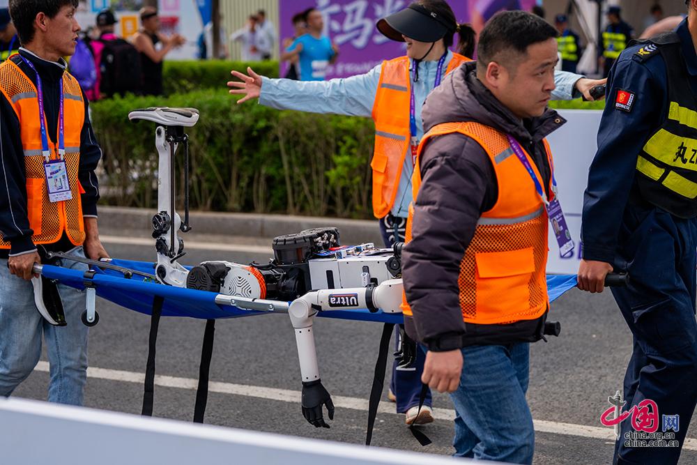 4月19日,2026北京亦庄人形机器人半程马拉松赛开跑,图为工作人员将机器人“救”离赛道。中国网记者 郑亮/摄影