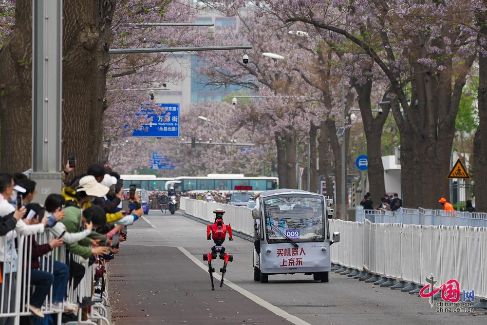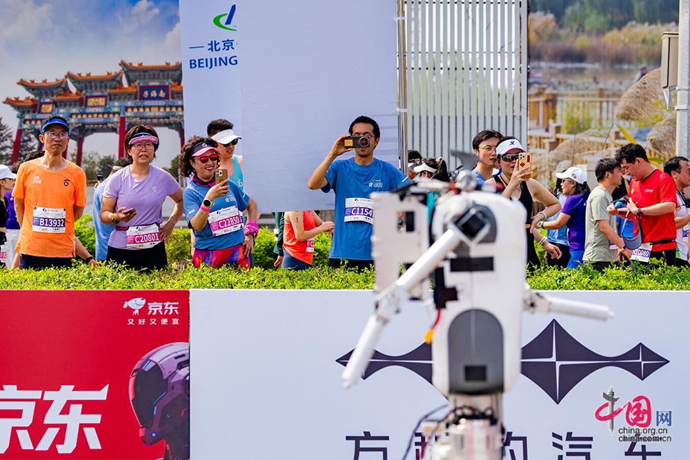 4月19日,2026北京亦庄人形机器人半程马拉松赛开跑,图为参加本次比赛的选手围观机器人跑者。中国网记者 郑亮/摄影