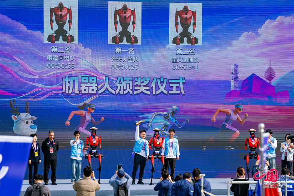 4月19日,2026北京亦庄人形机器人半程马拉松赛开跑,图为机器人前三名颁奖现场。中国网记者 郑亮/摄影