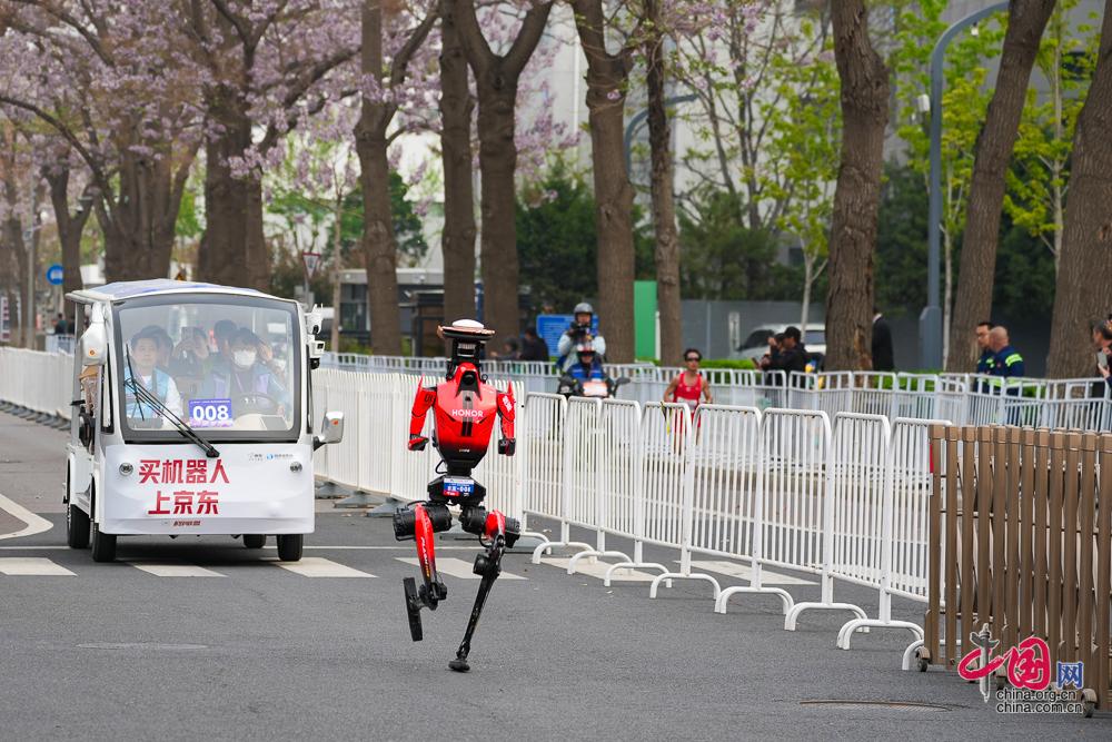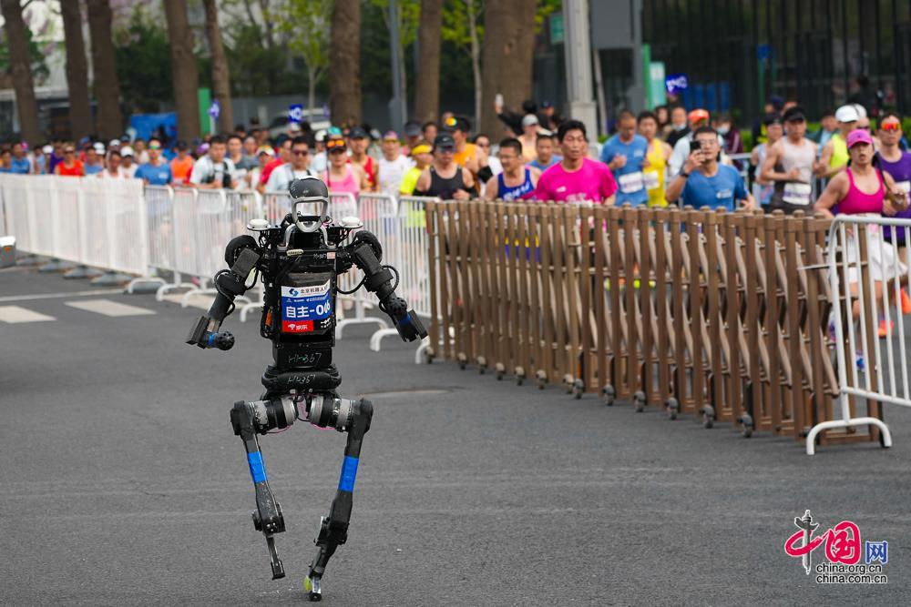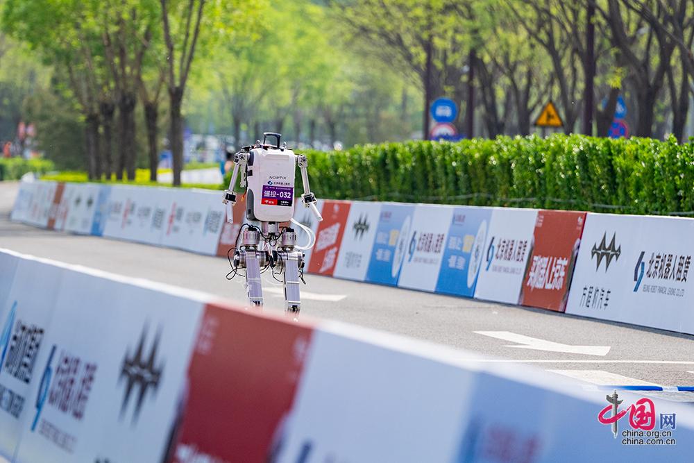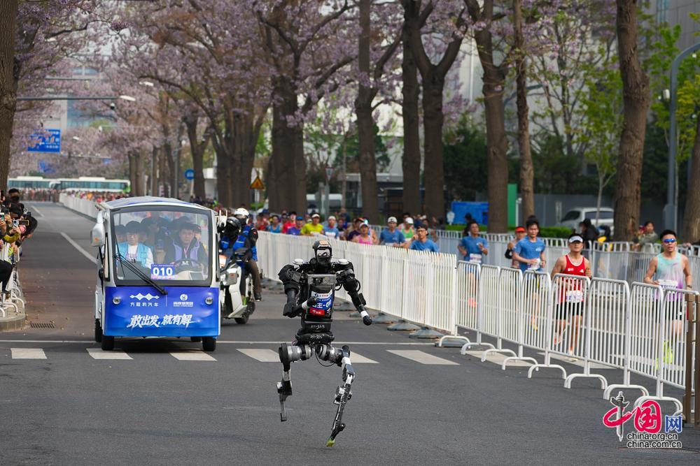 4月19日,2026北京亦庄人形机器人半程马拉松赛开跑,图为齐天大圣队的“闪电”机器人在比赛中。中国网记者/董宁 摄影