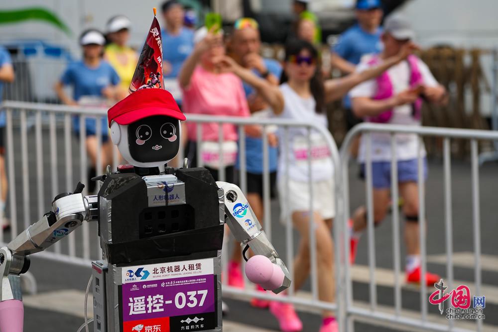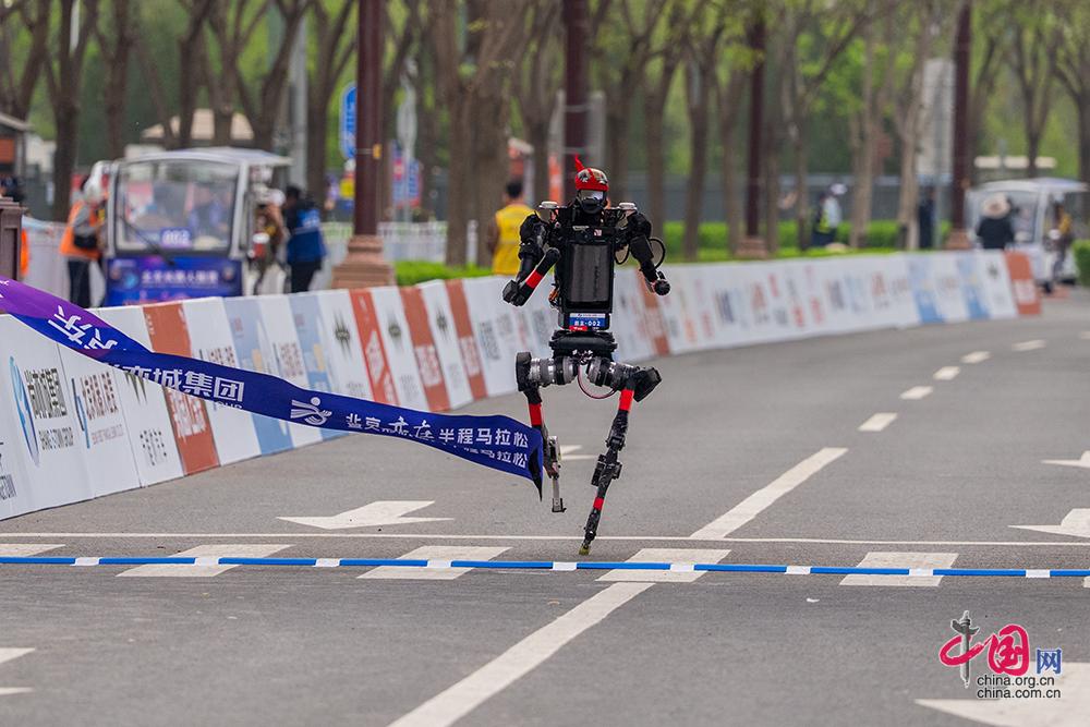 4月19日,2026北京亦庄人形机器人半程马拉松赛开跑,图为遥控操作组人形机器人冲过终点线。中国网记者 郑亮/摄影