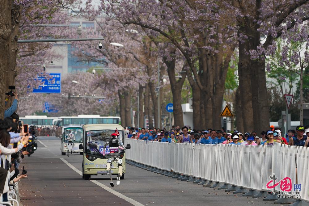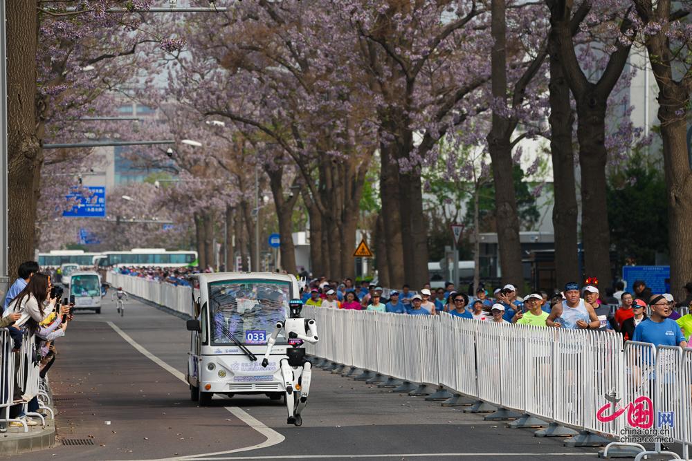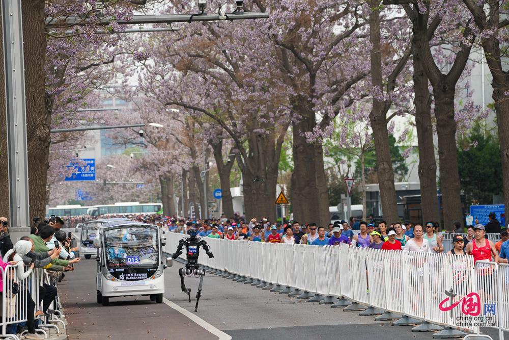 4月19日,2026北京亦庄人形机器人半程马拉松赛开跑,图为人形机器人和马拉松选手“同场竞技。”中国网记者 董宁/摄影