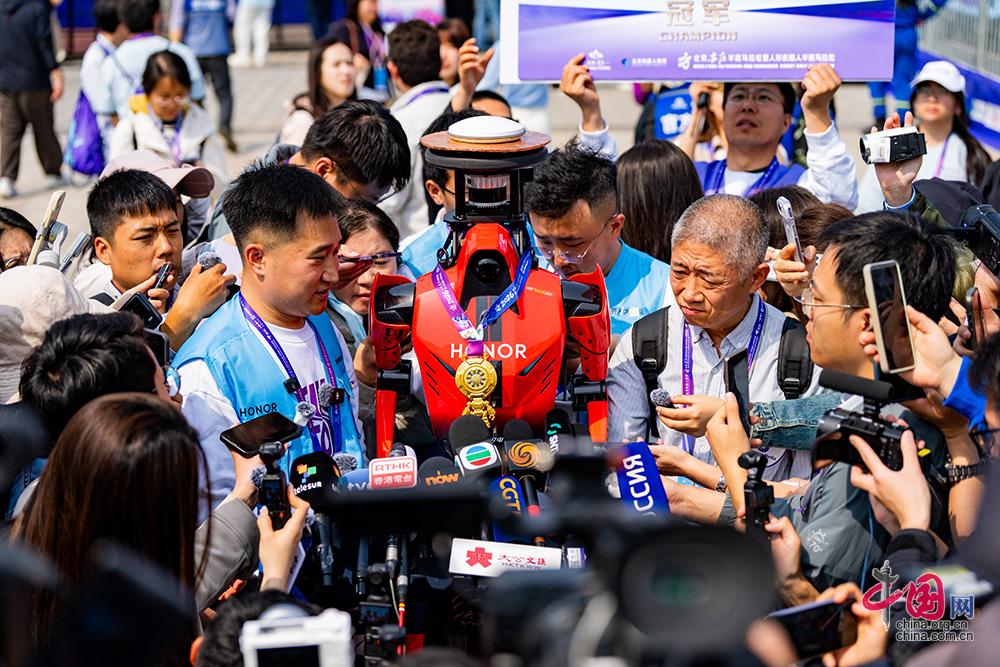 4月19日,2026北京亦庄人形机器人半程马拉松赛开跑,图为本次比赛冠军“选手”接受媒体采访。中国网记者 郑亮/摄影